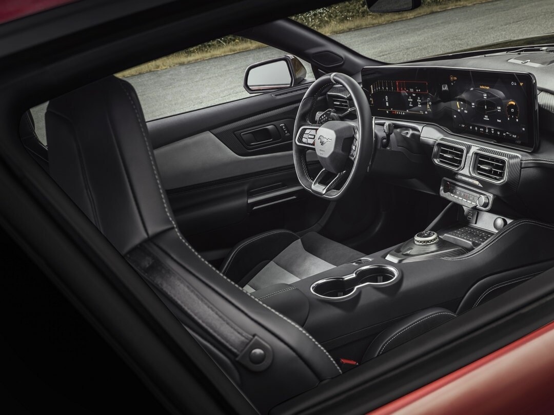 Slip behind the wheel and you're greeted by a cockpit designed for enthusiastic driving. The 2026 Mustang's cabin seamlessly blends retro design cues with modern technology. An available 12.4-inch digital instrument cluster lets you customize the display to your taste and features crisp, easy-to-read graphics. The standard SYNC 4 infotainment system boasts a huge 13.2-inch touchscreen with enhanced voice recognition, wireless Apple CarPlay and Android Auto, and connected navigation. Crank up the adrenaline-fueled soundtrack through the optional 12-speaker B&O premium audio system.