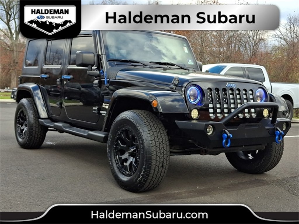 Recent Haldeman Trade In, New Tires, New Brakes, Leather Interior, Moonroof, Blue Tooth, SIRIUS XM, USB Port, Heated Seats, Oil and Filter Changed, 30,000 Miles Service Performed, New Cabin and Engine Air Filters Installed, Wrangler Unlimited Sahara, 3.6L V6 24V VVT, Black Clearcoat, Dark Saddle/Black w/Cloth Bucket Seats or Leather Trimmed Seats, Black 3-Piece Hard Top, Body Color 3-Piece Hard Top, Dual Top Group, Freedom Panel Storage Bag, Quick Order Package 24G, Rear Window Defroster, Rear Window Wiper/Washer.
